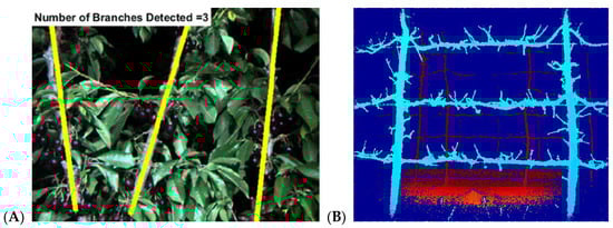 (A) Branch detection for sweet cherry trees in Y-Trellis (reproduced from [60]); and (B) branch detection for apple trees in V-trellis fruiting wall (from [61], used with permission).