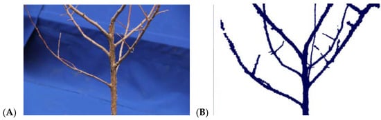 An example of tree reconstruction with 3D machine vision: (A) RGB image of the test tree; and (B) reconstructed tree [69].