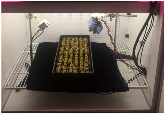 The chlorophyll a fluorescence (ChlF) detection system (FUSSY) was used to monitor real-time growth dynamics of Red Oakleaf lettuce (Lactuca sativa cv. Rouxai) grown in controlled environment growth chambers (Conviron A1000, Winnipeg, MB, Canada). These experiments were aimed at quantifying the relationship between growth and measured ChlF and to demonstrate that ChlF data remotely collected by this device can serve as an accurate proxy for lettuce growth. Rouxai red lettuce seeds (Cat. No. 3061.11) were obtained from Johnny’s Selected Seeds (Winslow, ME, USA). They were seeded in Grodan 1′′ Rockwool AX plugs (Grodan, Roermond, The Netherlands) in standard 1020 flats with 6 × 13 inserts (Gro-Smart Tray-Terracotta Model HDR1035-1, Grodan, Roermond, The Netherlands) at a constant day/night temperature of 23 °C and relative humidity of 70%. Temperature, relative humidity and atmospheric CO2 concentration were monitored by a Green Eye Desktop CO2, Temperature and Relative Humidity Monitor, (Model TIM-12, Global Sensors, Belmont, NC, USA) placed in the growth cabinet at canopy level. Plants were grown under 24 h photoperiods for 17 days at 200 µmol m−2 s−1 PAR under cool white fluorescent (CWF) tubes (Philips, F32T8/TL841, 800 series, Amsterdam, The Netherlands) and watered with half strength Hoagland’s solution [25].