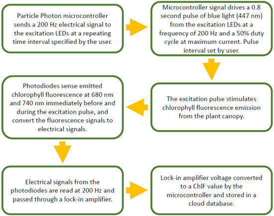 FUSSY consisted of an active LED light source and a photodiode-based detector which are described in detail below. The device had three basic components (described in detail below): (1) An LED excitation module which delivered an excitation pulse to the plant canopy, (2) A photodiode module which sensed and quantified chlorophyll fluorescence, and (3) A microcontroller which regulated the interval between the excitation pulses and moved the collected ChlF data to a cloud-based database. The excitation light source and the photodiode components were placed 50 cm from the crop canopy at 45° angles (Figure 1). The field of view of the photodiodes, and thus the area of the crop being sensed, was 12 cm in diameter. The device measured chlorophyll fluorescence at wavelengths of 680 nm and 740 nm using a six step process (described in Figure 2). The total cost of small volume production (five FUSSY units) was under $400 USD per unit.