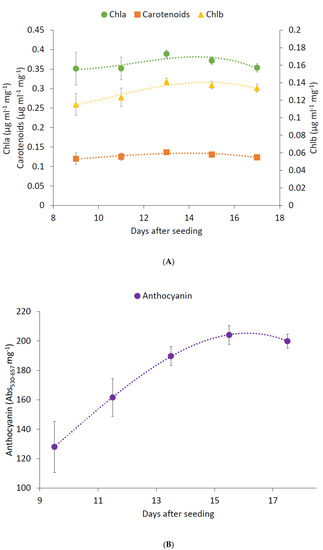 Chlorophyll and carotenoid concentrations were assayed at five time points between nine days after seeding (DAS) and 17 DAS (Figure 3). No significant change in mean chlorophyll a (Chla) or carotenoid content was observed in harvested plants during this period. Conversely, mean chlorophyll b (Chlb) concentrations significantly increased from 9 DAS to 13 DAS (p < 0.05), after which no significant change was observed. Anthocyanin concentrations were measured at the same time intervals as chlorophylls and carotenoids and significantly increased 1.6-fold from 9 DAS to 15 DAS (p < 0.001) after which they remained stable.