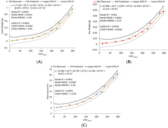 Final polynomial regression results for fresh weight (A), dry weight (B), and plant area (C), plotted as a function of chlorophyll fluorescence (ChlF740nm). Values represent means across four experimental replicates (n = 12). Dashed lines indicate 95% prediction intervals (PI). Error bars show standard errors of the mean (SEM).