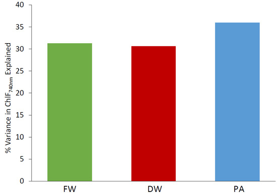 Percent variance in ChlF740nm explained by fresh weight (FW), dry weight (DW) and plant area (PA) of experimental plants as determined by multiple linear regression, followed by relative importance analysis.