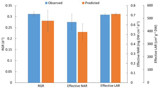 Relative growth rate (RGR), net assimilation rate (NAR), and leaf area ratio (LAR) calculated from observed and predicted dry weight and plant area values. Values are means of indices calculated with data from each experimental replicate (n = 4). Error bars show standard errors of the mean (SEM).