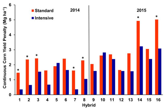 The yield penalty (yield difference between corn-soybean and continuous corn rotation) as influenced by two levels of management (standard vs. intensive) at Champaign, IL during 2014 (hybrids 1–8) and 2015 (hybrids 9–16). Hybrids 1–16 follow the order hybrids were presented in Table 3, Table 4, Table 5 and Table 6. Values represent the average of two planting populations. * CCYP (continuous corn yield penalty) significantly different at p ≤ 0.05, due to crop management for each hybrid.