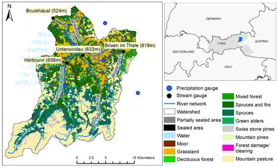 Location of the study area based on data of land use [29] and forest composition [30], with network of meteorological and hydrological stations, operated by the Hydrographic Service of Tyrol.