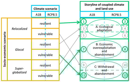While our climate scenarios were downscaled from global scenarios and were adapted to local conditions by the researchers, we used a mix of deductive and inductive methods for the development of our socio-economic scenarios. The deductive approach is based on the theoretical concept of community resilience, as developed by Geoff Wilson [46]. He defines community resilience as the capacity of a community to absorb natural or anthropogenic disturbances, and to reorganize in times of change. Communities under the pressure of globalization processes can react with different configurations of environmental, economic, and social capital within the following three possible stereotyped trajectories [46]: relocalization, where environmental and social capitals are given priority over economic growth; superglobalization, prioritizing economic capital over the two others; and glocalization, based on a balance of all three capitals. Thus, relocalized communities are perceived as normatively resilient, superglobalized ones as vulnerable, and glocal communities as in-between. Contrary to Wilson [46], for each of the three trajectories, we constructed expressions of resilience and vulnerability, based on different combinations of environmental, economic, and social (including cultural and political) capitals.