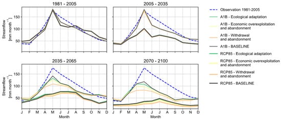 The results show that in the extreme climate scenario, precipitation declines by only 30% at most, however, the effects on streamflow are much stronger. In the moderate climate scenario, the mean annual streamflow decreases to about 70% of the reference figure, while in the extreme scenario, only one third of the streamflow remains (2070–2100 compared with 1981–2005). The main reason for this discrepancy is an increasing evapotranspiration as a consequence of the increases in temperature, combined with increased forest cover. Although water losses by snow sublimation are comparatively small, they reduce the input to streamflow, mainly for storylines (B) and (C), by their enlarging forest area. The effects increase over time with forest growth and, in the extreme climate scenario, the streamflow will have decreased from over 1000 mm to less than 400 mm by the end of the century. The results for streamflow per month reveal even more explicitly the connection with the different management options (Figure 4). The differences become very pronounced in the last third of this century. In the extreme scenario, water availability will decrease above all in spring, and the streamflow maximum will shift from May to July, indicating a regime shift from a snow-melt-dominated (nival) to a rain-dominated (pluvial) streamflow regime. For moderate climate change, the peak will remain in April/May, but the differences caused by the different land-use evolutions will become even more pronounced.