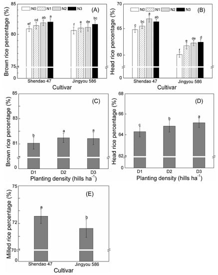 (A) Brown-rice and (B) head-rice percentage of two cultivars under different N rates; (C) brown-rice and (D) head-rice percentage under different planting density; (E) milled-rice percentage of two cultivars. N0, N1, N2, and N3 refer to nitrogen rate of 0, 140, 180, and 220 kg ha−1, respectively; D1, D2, and D3 refer to25 × 104, 16.7 × 104, and 12.5 × 104 hills ha−1, respectively. Data were averaged for two years. Different letters within each panel indicated significant differences at p < 0.05.