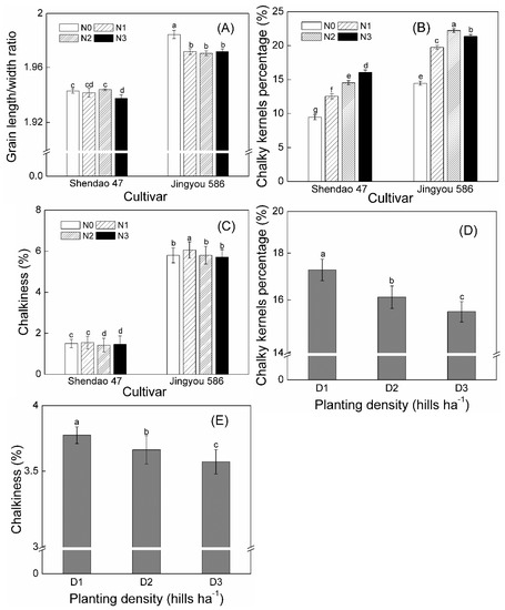 (A) Grain length/width ratio, (B) chalky-kernel percentage, and (C) chalkiness of two cultivars under different N rate; (D) chalky-kernel percentage and (E) chalkiness under different planting density. N0, N1, N2, and N3 refer to nitrogen rate of 0, 140, 180, and 220 kg ha−1, respectively; D1, D2, and D3 refer to25 × 104, 16.7 × 104, and 12.5 × 104 hills ha−1, respectively. Data were averaged for two years. Different letters within each panel indicated significant differences at p < 0.05.