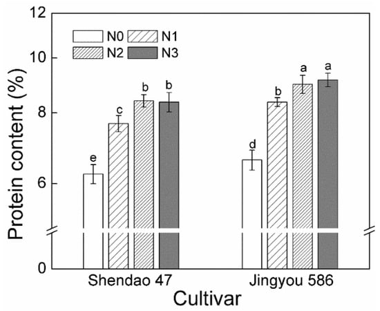 Protein content of two cultivars under different N rates. N0, N1, N2, and N3 refer to a nitrogen rate of 0, 140, 180, and 220 kg ha−1, respectively. Data were averaged for two years. Different letters indicated significant differences at p < 0.05.