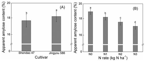 (A) Apparent amylose content of two cultivars; (B) apparent amylose content under different N rate. N0, N1, N2, and N3 refer to nitrogen rate of 0, 140, 180, and 220 kg ha−1, respectively. Data were averaged for two years. Different letters within each panel indicated significant differences at p < 0.05.
