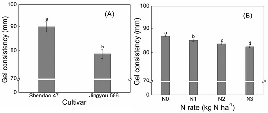 (A) Gel consistency of two cultivars; (B) gel consistency under different N rates. N0, N1, N2, and N3 refer to a nitrogen rate of 0, 140, 180, and 220 kg ha−1, respectively. Data were averaged for two years. Different letters within each panel indicated significant differences at p < 0.05.
