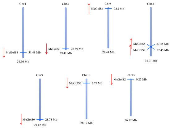 Chromosomal locations of 8 predicted MeGolS genes. The chromosome number is marked upon each chromosome. The red arrows indicate gene orientation on chromosomes. The number below each chromosome indicates chromosome size. The number next to each gene represents the position of the gene on the chromosome.