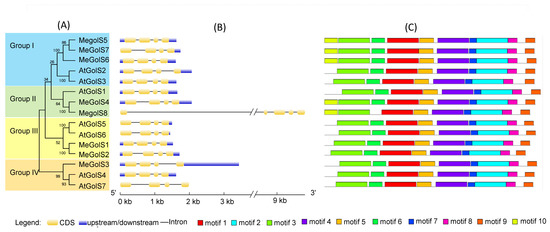 Comparative analysis of the phylogenetics, structure, and conserved motifs of GolSs from cassava and Arabidopsis. (A) The phylogenetic tree of MeGolSs and AtGolSs was constructed by using MEGA 7.0 and all the GolSs were classed into four groups. (B) GSDS software was employed to generate the gene structures of MeGolSs and AtGolSs. The yellow boxes are CDS, the blue boxes are 5′UTR or 3′UTR, and the black lines are introns. (C) Conserved motifs of MeGolSs and AtGolSs proteins from cassava and Arabidopsis. The gene order in B and C is similar to A.