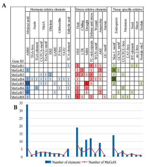 To better uncover the potential function of the MeGolS genes, the cis-elements within these promoters were identified by PlantCARE. A total of 74 types of cis-acting elements were detected in the promoters of MeGolSs (Table S3), among which were 10 types of hormone-related, 7 tissue specific-related, and 7 stress-related elements (Figure 3). These hormone-related elements included abscisic acid responsive elements (ABRE), MeJA-responsive elements (CGTCA-motif and TGACG-motif), ethylene-responsive elements (ERE), salicylic acid responsive elements (TCA-element), gibberellin-responsive (GARE-motif, P-box and TATC-box), and auxin-responsive elements (TGA-box and TGA-element). ABRE elements were found to be the most abundant hormone-related elements in six of eight MeGolSs. MeGolS4 had nine of the 10 hormone-related elements. MeGolS1 and MeGolS2 had one hormone-related element ABRE or TCA-element, respectively. These tissue specific-related elements included a shoot-specific expressive element (as-2-box), meristem expressive elements (CAT-box and CCGTCC-box), endosperm expressive elements (GCN4-motif and Skn-1-motif), a seed-specific expressive element (RY-element), and a nodule-specific expressive element (Nodule-site2). The Skn-1 motif was the most abundant tissue specific-related element in MeGolS promoters. The numbers of tissue specific-related elements in each MeGolS promoter ranged from one to three. These stress-responsive elements included heat stress (HSE), low-temperature stress (LTR), drought stress (MBS), wound stress (WUN-motif), anaerobic stress (ARE), anoxic stress (GC-motif), and defense and stress responsive element (TC-rich repeats). At least three of these stress-responsive elements were found to be included in each MeGolS promoter. HSE was the most abundant stress responsive related element and was found in all the 8 MeGolS promoters.