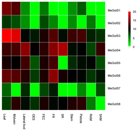 To understand the expression abundance of the MeGolS gene family in different tissues or organs, 11 tissues or organs of cassava were analyzed based on the RNA-seq datasets from cassava. The heatmap results showed that the eight MeGolS genes had different expression patterns in tissues and organs (Figure 4). Seven of eight MeGolS genes were expressed in mid-vein (except MeGolS7), fibrous roots (FR) (except MeGolS1), stem (except MeGolS7), and petiole (except MeGolS2); six of eight MeGolS genes were expressed in root apical meristem (RAM) (except MeGolS1, and MeGolS7); five of eight MeGolS genes were expressed in somatic organized embryogenic structures (OES) (except MeGolS1, 2, and 7), shoot apical meristem (SAM) (except MeGolS1, 2, and 8); only 4 MeGolS genes (MeGolS3, 4, 6, and 8) were expressed in storage roots (SR). The genes with the highest expression levels were, MeGolS3 in leaf, mid-vein, stem, and petiole; MeGolS4 in the lateral bud, OES, FEC, SR, and SAM, MeGolS5 in RAM; and MeGolS6 in FR. At gene expression levels, three MeGolS genes (MeGolS3, 4 and 6) were expressed in all 11 tissues and organs; MeGolS5 and 8 were slightly expressed in 10 tissues and organs, respectively, except MeGolS5 in SR and MeGolS8 in SAM; MeGolS2 is slightly expressed in seven tissues and organs except OES, SR, petiole, and SAM; MeGolS1 was only expressed in leaf, mid-vein, lateral bud, FEC, stem, and petiole; while MeGolS7 was only slightly expressed in leaf, lateral bud, FEC, FR, petiole, and SAM.