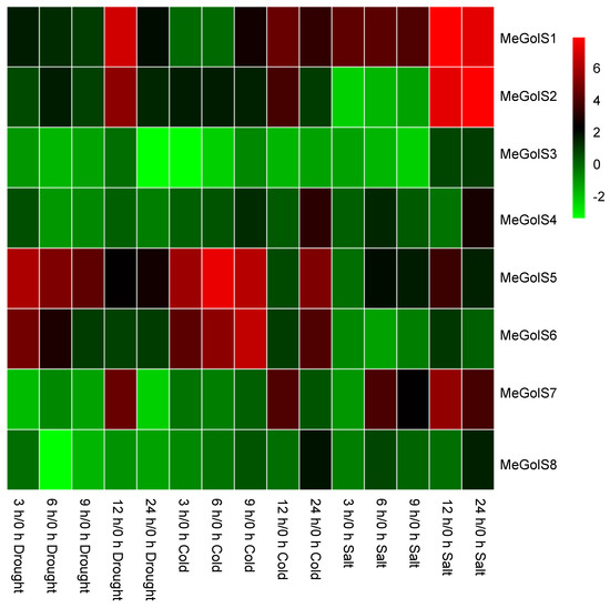 To establish the MeGolS gene expressions under abiotic stresses, quantitative real-time RT-PCR data from different abiotic stressors (drought, cold, and salinity) and different treatment times (3 h, 6 h, 9 h, 12 h, and 24 h) were gathered to construct a heatmap. The expression abundance of each MeGolSs was obviously different among different stresses and treatment times (Figure 5). The expression patterns of MeGolS5 and MeGolS6 were similar in response to drought stress, during which both were upregulated and peaked at 3 h; MeGolS1 and MeGolS2 had similar expression patterns and peaked at 12 h; MeGolS3, 4, and 8 were downregulated. Regarding response to cold stress, six of eight tested MeGolSs except MeGolS3 and 8 were upregulated, during which MeGolS5 and MeGolS6 had similar expression patterns, with higher expressions from 3 h to 24 h except at 12 h; MeGolS1, MeGolS2, and MeGolS7 peaked their expressions at 12 h; MeGolS4 was slightly upregulated, and peaked at 24 h; however, MeGolS3 and 8 were downregulated at all time points. MeGolS1 was highly induced at all time points in response to salinity and peaked at 12 h; MeGolS5 and MeGolS7 had similar expression patterns, which were downregulated at 3 h, then upregulated from 6 h to 24 h, with a peak expression at 12 h; MeGolS2 and 6 were downregulated from 3 h to 9 h, and upregulated from 12 h to 24 h; MeGolS2 was highly expressed at 24 h; and MeGolS4 was upregulated at 6 h and 24 h. MeGolS3 and 8 were downregulated in all stages.