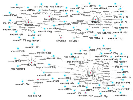 The red dot indicates the MeGolS genes, the blue dot indicates the miRNAs that targeting MeGolSs.