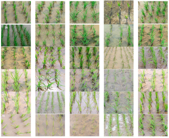 The test images in our paper were collected from Agricultural Research and Demonstration Base of Anhui Agricultural University, which is located in Anhui province, China (30.57 N, 117.01 E). In the field, rice (cultivar: Fengliangyou No.4, Huiliangyou 898, Zhendao No.18 and Shangnongjing No.2) was planted. Fengliangyou No.4 and Huiliangyou 898 are two types of hybrid indica rice and Zhendao No.18 and Shangnongjing No.2 are two types of conventional japonica rice, which are widely planted in southern China. The transplanting time and model are identical with those of local custom farm practices. The inter-row space was about 20–30 cm. The plant density was approximately 27 × 104–30 × 104 hole/ha and 4–5 seedlings per hole. The total area of each rice cultivar was about 0.15 ha.
