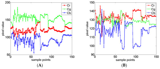 Values of the Cr, Cg and Cb components for (A) rice seedling and (B) background sampling points.