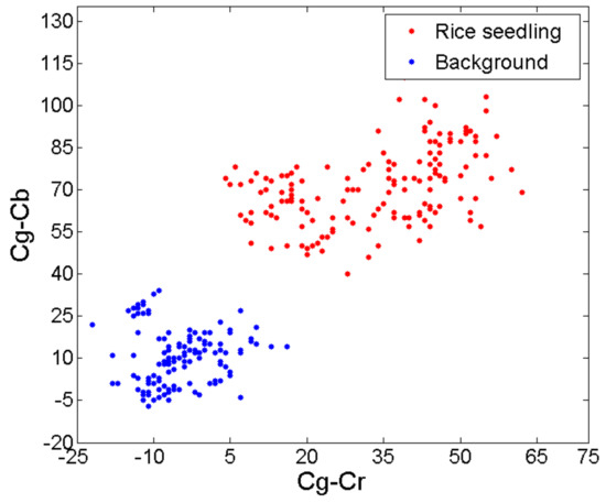 In order to describe the color difference between the rice seedlings and the background effectively, the differences between the Cg and Cr, and between the Cg and Cb of the sampling points are calculated, respectively. Figure 5 describes the relationship between Cg-Cr and Cg-Cb for the rice seedling and background sampling points. In Figure 5, the horizontal axis shows the value of Cg-Cr and the vertical axis shows the value of Cg-Cb From Figure 5, it can be noted that the rice seedling points and the background points converge in different bounded regions of the (Cg-Cr, Cg-Cb) plane. Therefore, one or more boundary lines can separate rice seedlings and the background. According to the definition of a straight line, the boundary line can be defined as: