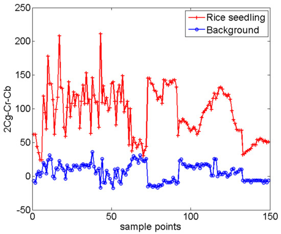Figure 6 shows the distribution of 2Cg-Cr-Cb of the rice seedling and background sampling points, where the contrast between the rice seedlings and the background is clear. As a result, we are motivated to use 2Cg-Cr-Cb as the color index to extract the gray image.