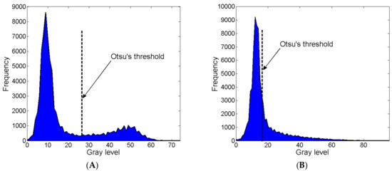 The Otsu method is easy to implement because it involves a simple mathematical expression when calculating the optimal threshold. As mentioned in [25], a single threshold T decided by the Otsu method is equal to the average of mean values of the two classes. Thus, the Otsu method can obtain a satisfactory segmentation only when C1 and C2 classes have a similar variance. In other words, the Otsu method works well for images with a clear bimodal distribution. As shown in Figure 7A, Otsu’s threshold is located at the valley between two consecutive peaks, and the two classes’ variances are in contrast to each other. However, the threshold biases toward the class with the larger variance (as shown in Figure 7B) when the histogram with a single peak is unimodal or near-unimodal. Hence, it is necessary to improve the Otsu method for selecting the desired threshold in unimodal or near-unimodal histograms of images.