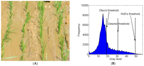 Aiming at automatically selecting the desired threshold for both bimodal and unimodal images, the neighborhood valley-emphasis (NVE) method [26] is a modified form of the Otsu method which selects a threshold that has a small probability of occurrence by adding a weight to the between-class variance. The weight is obtained from neighborhood information around the valley point in the gray-level histogram. Figure 8A shows a rice seedling image. The rice seedling is small compared with the size of the background. The corresponding image histogram shown in Figure 8B is a near-unimodal distribution. Unlike Otsu’s threshold, which is located towards the class with the largest variance, the NVE’s threshold is located at the right rim of the histogram, which results in almost all rice seedlings being wrongly segmented as the background. This means that the NVE method performs well when the histogram of images has enough valley information. However, in rice seedling images, most of the rice seedling area, in which the seedlings have just been transplanted by a rice transplanter, is much smaller than the background area in paddy fields. The images do not have enough valley information in this case. Therefore, the NVE method, which uses valley neighborhood information as the weight, still cannot improve the segmentation equality of rice seedlings. In this subsection, we propose an improvement to the Otsu method by adding a weight parameter to the within-class variance. The details of the improved Otsu method are described as follows.