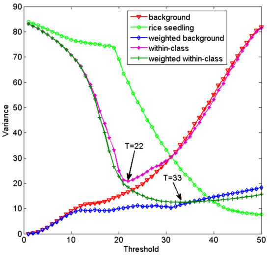The within-class variance of the Otsu method defined as Equation (11) contains two classes. Let the first item denote the background variance and the second item be the rice seedling variance. According to [25], the background class in the rice seedling image mainly determines the desired threshold. To obtain a desired threshold, the first item should contribute less to the within-class variance. In this regard, the parameter , ranging from 0 to 1, is introduced to weight the first item. Now, the weighted background variance is times the original background variance, which influences the within-class variance. Using , Equation (11) can be modified as:
