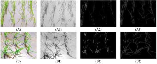 The rice seedling images and the processing results by applying the different graying processing methods: (A) the original image with shadow on a cloudy day; (A1–A3) the corresponding results of G component, ExG and 2Cg-Cr-Cb graying methods; (B) the original image with highlights on a sunny day; (B1–B3) the corresponding results of G component, ExG and 2Cg-Cr-Cb graying methods.