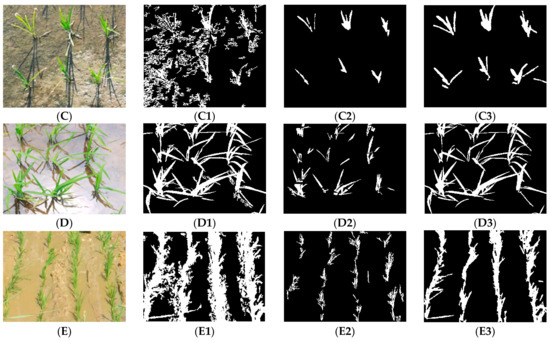 Segmentation results of the five test images by the proposed method and two other methods. (A–E) are the original rice seedling images; (A1–E1) show segmentation results by Otsu; (A2–E2) give segmentation results by NVE; and (A3–E3) present segmentation results by the proposed method.