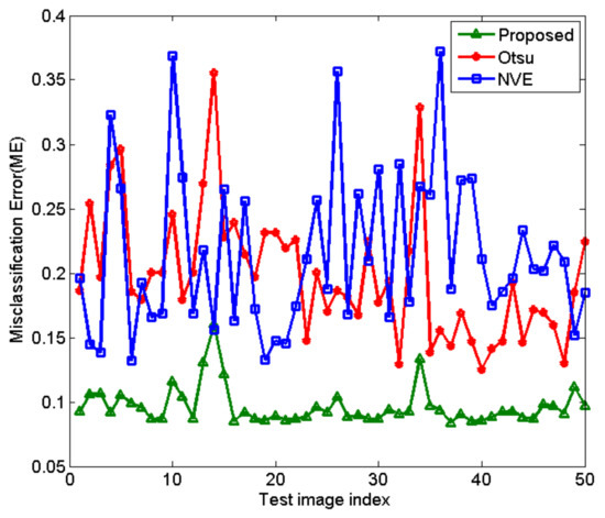 Additionally, the performance of the proposed method can be evaluated quantitatively, and one common metric is used in this study: the Misclassification Error (ME) [27]. The ME metric describes the percentage of object pixels incorrectly detected as the background, and vice versa. The ME metric is defined as: