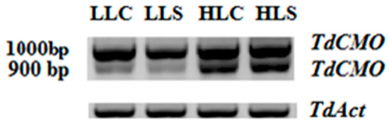 To isolate the putative TdCMO gene transcripts in durum wheat, a RT-PCR analysis was carried out. Total RNA was isolated from young leaves (each sample constituted a pool of 30 leaves) of durum wheat grown in different conditions: control (LLC; 0 mM NaCl, 350 μmol m−2 s−1 PAR), high salinity (LLS; 100 mM NaCl, 350 μmol m−2 s−1 PAR), high light (HLC; 0 mM NaCl, 900 μmol m−2 s−1 PAR), and high light and salinity (HLS; 100 mM NaCl, 900 μmol m−2 s−1 PAR). All RT-PCR reactions were performed as triplicates on three independent biological replicates.