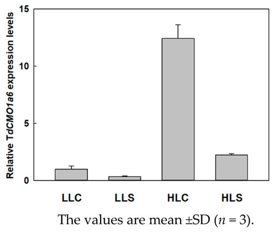 To evaluate TdCMO1a6 expression in LLS, HLC, and HLS compared to LLC, aqRT-PCR analysis was performed using a specific primer pair (Figure 2). As shown in Figure 2, LLS TdCMO1a6 expression was 70% lower than LLC, while HLC expression was about 12-fold higher when compared to LLC. HLS TdCMO1a6 gene expression was two-fold higher than that of LLC; however, it remained substantially lower than HLC (Figure 2).
