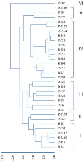 Based on the variation among different morphological characteristics, six distinct clusters were seen for the SSE germplasm (Figure 1). The first cluster (group I) included SSE 1, SSE3, SSE34, SSE112, SSE115 and SSE117. The second cluster (II) included SSE40 and SSE108. The third cluster (III) included SSE4, SSE5, SSE6, SSE24, SSE29, SSE30 and SSE35. The fourth cluster (IV) included SSE7, SSE10, SSE15, SSE22, SSE31, SSE38, SSE42, SSE86, SSE92, SSE93, SSE99, SSE104, and SSE132. The fifth cluster (V) included SSE8, SSE79 and SSE119. Cluster six (VI) included SSE80 alone.