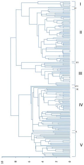 Analysis of the morphological traits among 208 accessions of USDA resulted in 10 clusters, five of which were major and five of which were minor (Supplemental Table S4). The minor clusters contained few accessions. Overall, a variable number of genotypes were found in each cluster (Figure 2). Major Cluster 1 (V on Figure 2) contained 29 accessions; 8 from A. caudatus, 8 from A. cruentus, 4 from A. hybridus, 5 from A. hypochondriacus and 4 from A. quitensis. This cluster represented 12 accessions from South America, 4 accessions from North America, 2 accessions from Africa, 4 accessions from Asia and 7 accessions from Central America. They were predominantly cultivated except for the A. hybridus and A. quitensis genotypes which are direct ancestors of the cultivated species.