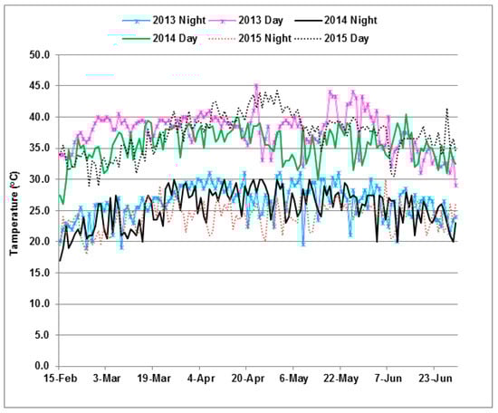 The trial under DSHTS was conducted during the dry season in 2013, 2014, and 2015. In each year, the lowest day and night temperatures were recorded in February at the time of planting and the highest in April. During evaluation of this trial, there were incidences of rains in the months of April and May, but the amounts were not sufficient to have significant effects on the intensity of drought stress under elevated temperature. In each year, the peak of high temperature occurred in April (Figure 1), which coincided with the reproductive and grain-filling stages of the maize crop. During this period, the maximum day and night temperatures were 45 and 31 °C, respectively, which were detrimental to fertilization, seed setting, and grain-filling in maize. Minimum day and night temperatures of ≤27 °C and ≤20 °C, respectively, are considered to be optimal for the growth and development of maize in the tropical lowlands.