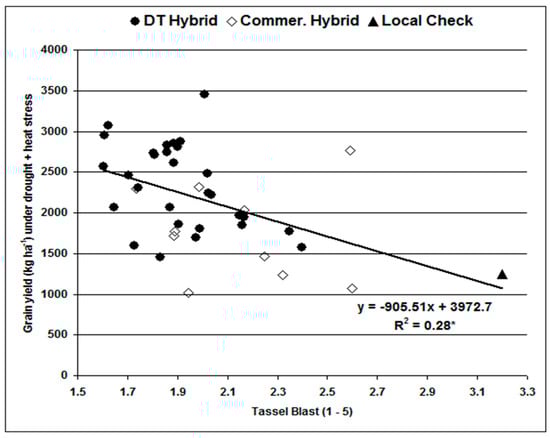 Regression of grain yield (kg ha−1) of 29 drought tolerance (DT) hybrids, nine commercial hybrids, and a local check on tassel blast under combined drought and heat stress.