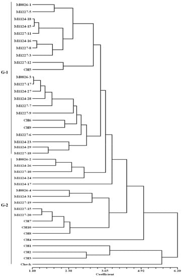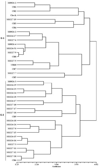 A dendrogram generated from the standardized data of grain yield, plant and ear aspect scores, EPP and ASI is presented in Figure 3. Under DSHTS, the hybrids were classified into two major groups (G-1 and G-2). The first group consisted of 19 hybrids, including seven DT hybrid eight commercial hybrids (CH1, CH2, CH3, CH4, CH5, CH7, CH8, and CH10), three released hybrids (M0826-2, M0826-3, and M0826-4), and the local check. Most hybrids in this group had low grain yields, high number of BP and TB. The second group consisted of 21 hybrids involving 18 DT hybrids, two commercial hybrids (CH6 and CH9), and a released hybrid (M0826-3). Most hybrids in this group had high grain yields, good plant type, few BP and less TB, but poor ear aspect scores.