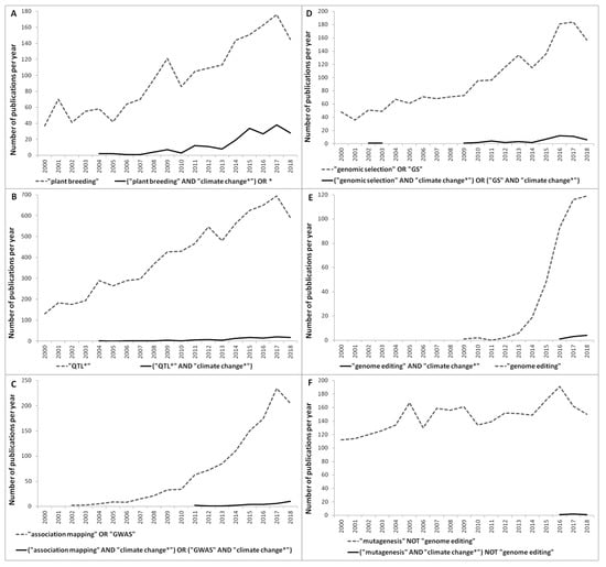 Number of publications in which the most recent and breakthrough technologies applied to plant breeding are associated (___) or not (---) with climate change. (A) Keyword: plant breeding; (B) keyword: QTL*; (C) keywords: association mapping or GWAS; (D) keywords: genomic selection or GS (E) keyword: genome editing; (F) keywords: mutagenesis NOT genome editing. * complete query = (“plant breeding” AND “climate change *”) OR (“association mapping” AND “climate change*”) OR (“gwas” AND “climate change*”) OR (“genomic selection” AND “climate change*”) OR (“mutagenesis” AND “climate change*”) OR (“QTL*” AND “climate change*”).