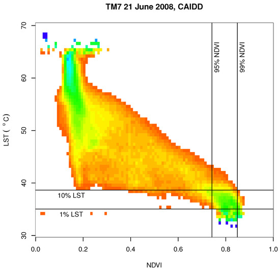41] who demonstrated the approach over almonds in a California study. Given a 30 m resolution TM scene, choose as cold reference pixels all those within 95–99% Normalized Difference Vegetation Index (NDVI) quantiles and also with 1–10% LST quantiles as illustrated in