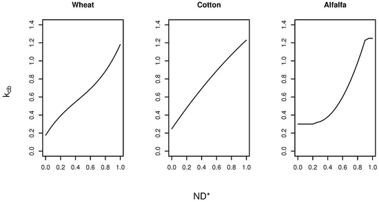 50], where wheat, cotton, and alfalfa crops were grown under controlled irrigation regimes and frequently monitored with proximal sensing of NDVI. The approach aims to use remotely sensed vegetation indices as a proxy for the crop coefficient