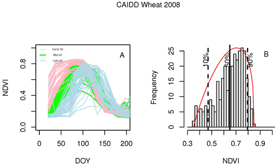 Figure 5B), bins were re-scaled to lie between 0 and 1, a Beta distribution function was fit, quantiles at 10% and 90% probabilities identified, then indices transformed back to original NDVI space by inverting Equation (
