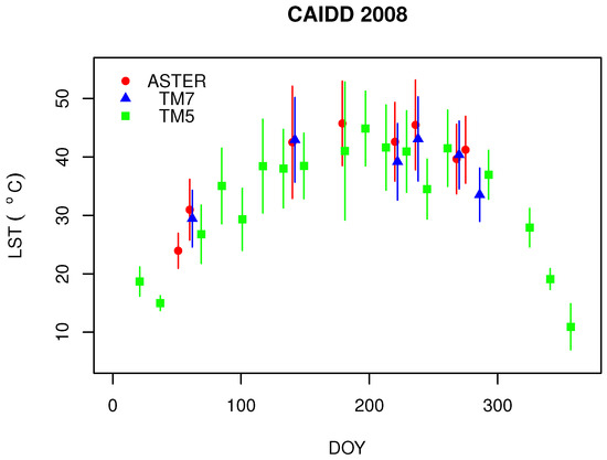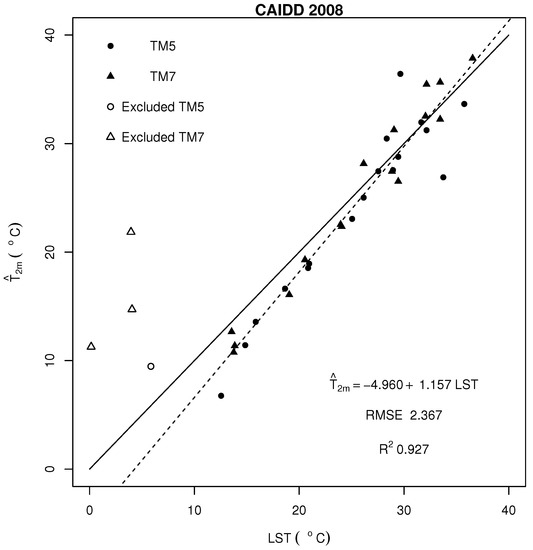 Figure 2. While the quantile selection could be fully automated, subjectivity when choosing quantiles was retained in order to balance the need for large (>1000) sample sizes while minimizing outliers. Next, for each selected cold pixel, neighboring pixels within a fixed search radius were scanned for maximal LST. The radius was set to 300 m, a value to approximate the typical CAIDD field size × 2 to improve the probability of finding bare soil pixels. Third, using all previously selected cold/hot value pairs, median hot and cold pixel values were computed and used to estimate the