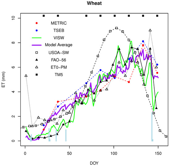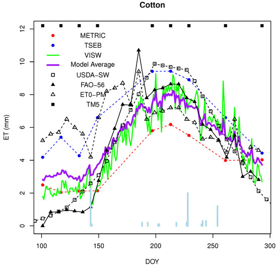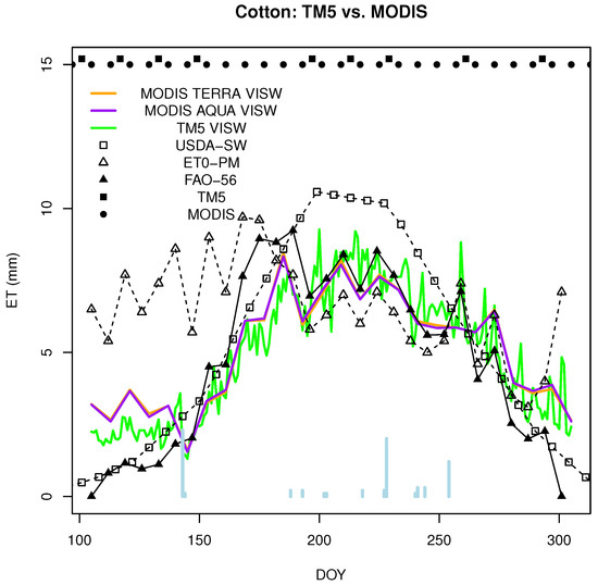 ) because doing so would require knowing irrigation dates at plot scales, information unavailable. Consequences for the simplification depends upon irrigation practices, crop type, crop stage, and time of year. The greatest impact could be low total ET estimates of 10–15% on weekly time steps (Hunsaker personal communication). However, the underestimation is less during winter or where crop canopy is full. Examples of