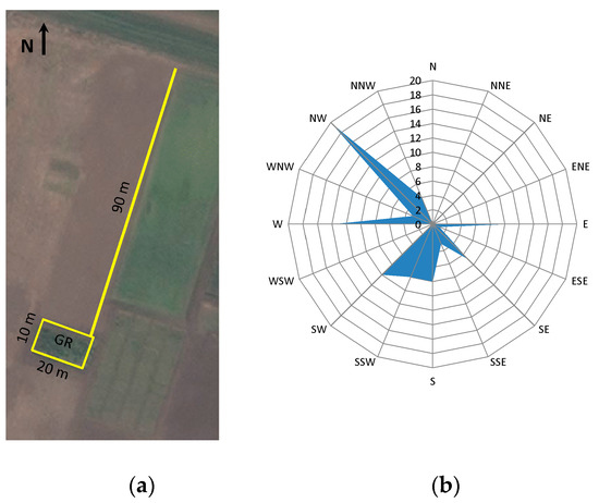 In 2009, 100 Lolium perenne plants were harvested from a glyphosate-resistant population located in the south of the Buenos Aires province (Argentina; 38°25′ S, 60°58′ W). The mechanism of resistance involved, and the inheritance of glyphosate resistance of that population, have been previously studied [20,21,22]. The collected seeds were sown in a plot of 10 × 20 m during March 2011 in the Chacra Experimental Integrada Barrow (INTA-MAIBA; 38°19′ S, 60°14′ W) as the source of pollen from glyphosate-resistant plants. The planting was carried out after tilling the soil with a disc harrow. An experimental plot seeder, with six rows spaced 0.2 m from each other and calibrated for a seed rate of 10 kg ha−1, was used. In similar conditions, seeds of susceptible L. perenne plants from a pasture without a history of glyphosate selection were used as pollen receptors. The susceptible plants were sown in six rows (spaced 0.2 m from each other) at the contour of the glyphosate-resistant source, and a plot of 1.2 × 90 m from the source of pollen (Figure 1a). This receptor plot was oriented toward the northeast, taking into account the anemophilous type of pollination of L. perenne, and the dominant winds during the pollination period, according to the CEI Barrow agrometeorological station register (Figure 1b).