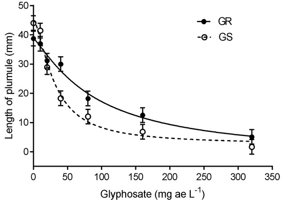 Effects of glyphosate on plumule growth of the progenies of glyphosate-resistant plants (positive control, GR) and glyphosate-susceptible plants (negative control, GS). Symbols indicate mean values, and vertical bars represent ±1 standard error. Non-linear regression models are shown by lines (GR (p < 0.05 and R2 = 0.98): y = −2.0 + (38.8 − (−2.0))/(1 + (x/90.7)1.2) and GS (p < 0.05 and R2 = 0.98): y = 2.5 + (45.1 − 2.5)/(1 + (x/30.5)1.5)).