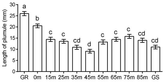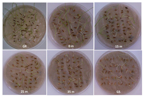 At this glyphosate concentration, the highest mean plumule length was recorded for the progeny of positive control (GR), while the progeny of negative control (GS) showed a mean plumule length of half of that determined on the progeny of GR (Figure 3 and Figure 4). The progeny obtained from receptor plants located close to glyphosate-resistant pollen donor plants (0 m) showed no significant differences in plumule growth, compared with positive controls (Figure 3). Mean plumule length was not significantly different to the negative control when the distance between glyphosate-resistant plants and pollen receptors was ≥15 m (Figure 3).