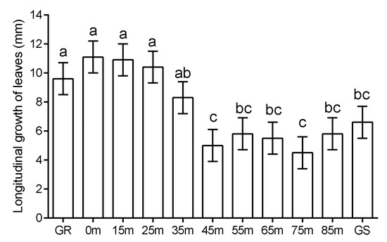 Glyphosate effects on longitudinal growth of leaves of the progeny of pollen receptor plants (spaced from 0 to 85 m from the glyphosate-resistant plants as the source of pollen), glyphosate-resistant plants (GR, positive control) and isolated glyphosate-susceptible plants (GS, negative control). Bars indicate mean values, error bars represent ±1 standard error, and bars with the same letters are not significantly different (p > 0.05; Tukey’s HSD test).